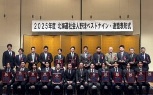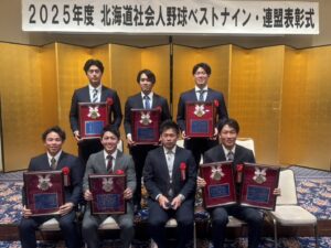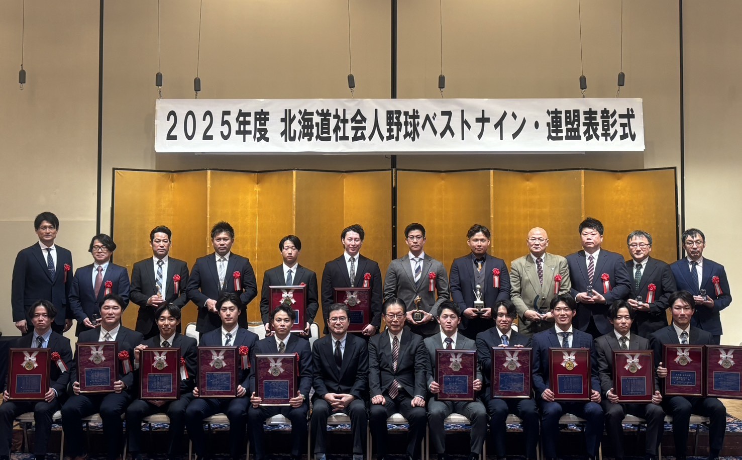 日頃より、JR北海道硬式野球クラブにご声援いただきありがとうございます。 12月13日(土)、2025年度北海道社会人野球ベストナイン表彰式がおこなわれました。 弊部より6名が選出されました。 また、優秀チーム賞、新人賞、功績賞も受賞しました。 関係分 投手:夏井康吉(初) 捕手:村北翔哉(初) 一塁:南木寿也(4) 二塁:南 泰成(初) 三塁:俵藤夏冴(初) 外野:大槻龍城(初) 優秀チーム賞:JR北海道硬式野球クラブ 新人賞:南 泰成 功績賞:福山 雄