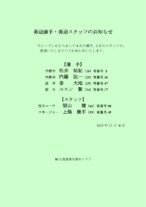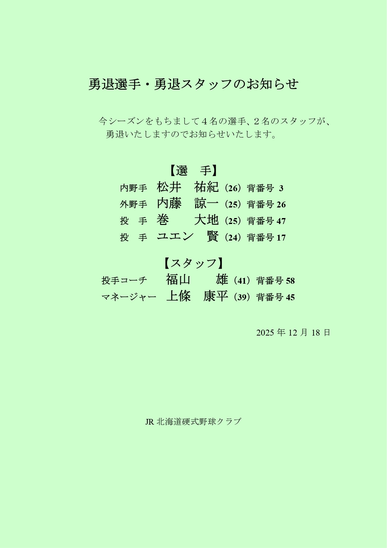 日頃より、JR北海道硬式野球クラブにご声援いただきありがとうございます。 12月17日本社において、納会がおこなわれました。 本年は、乙須新監督の下で、5年ぶりに都市対抗野球に出場することができました。 これは後援会の皆様、社員の皆様、OB会の皆様の格段のご声援、ご協力をいただいて達成できたことです。ありがとうございました。 来シーズンは、都市対抗本大会、日本選手権本会に必ず出場し勝ち進むために、勤務の合間を利用して練習を続けてまいります。 勇退選手、スタッフを紹介いたします。